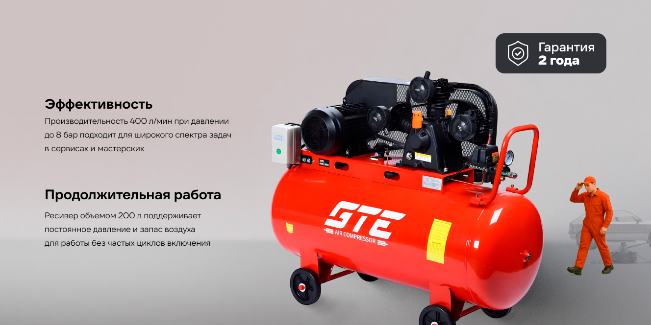 Компрессор поршневой с ременным приводом GTE 380В, ресив. 200л, 400л/мин. -MR4200400A GTE-MR4200400A