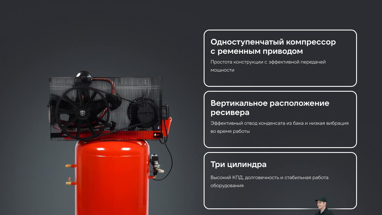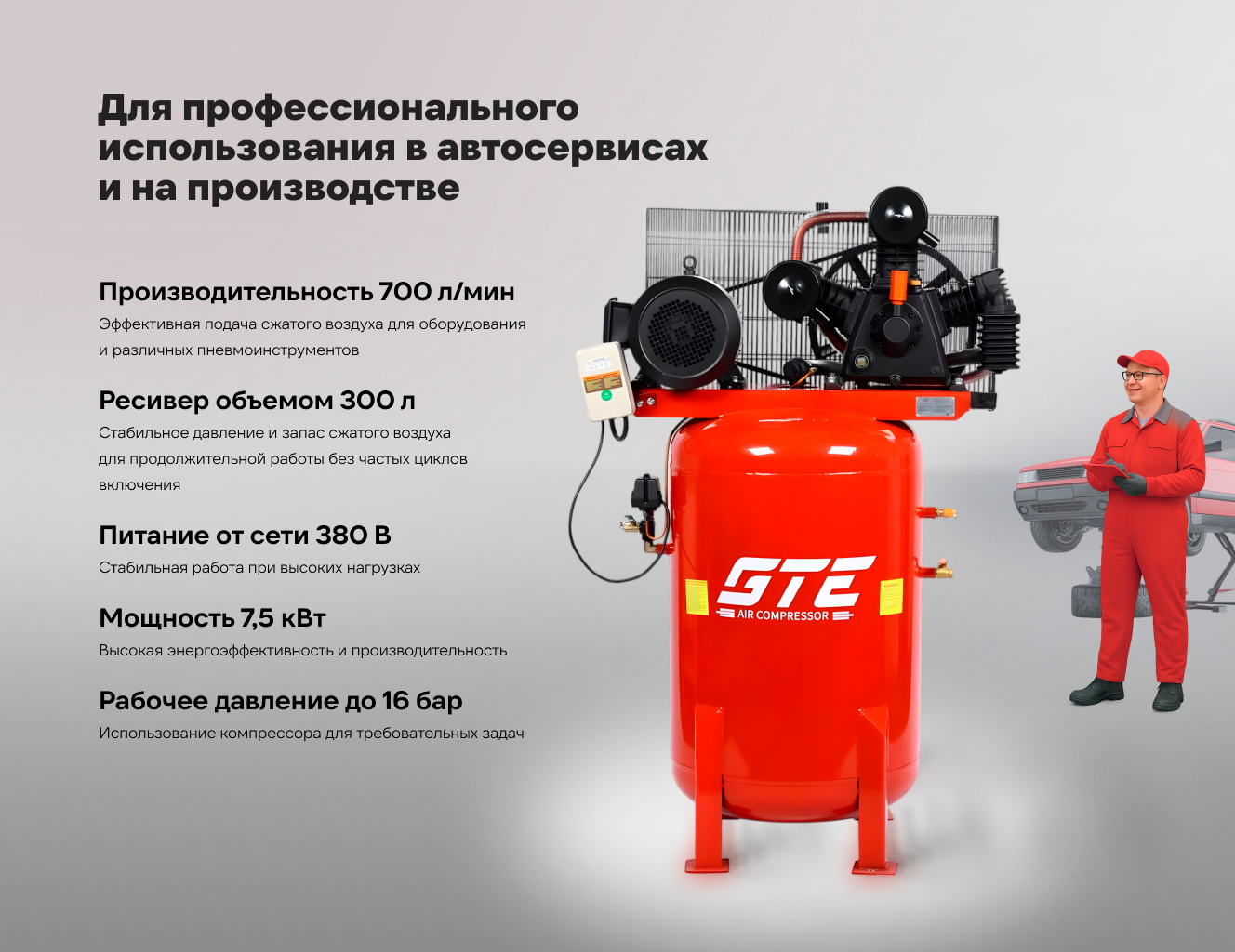 Объем ресивера составляет 300 литров, обеспечивая стабильное давление воздуха. Компрессор оснащен мощным электрическим двигателем мощностью 7,5 кВт (10 л.с.), что гарантирует эффективную работу.