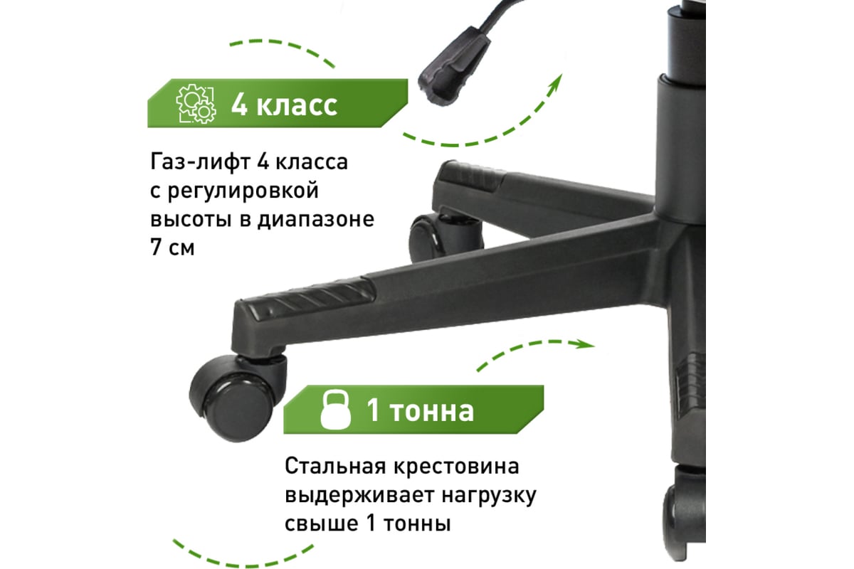 Регулировка высоты сиденья осуществляется с помощью газлифта 4 класса, который выдерживает нагрузку до 150 кг и прекрасно подходит для кресел с повышенной рабочей нагрузкой.