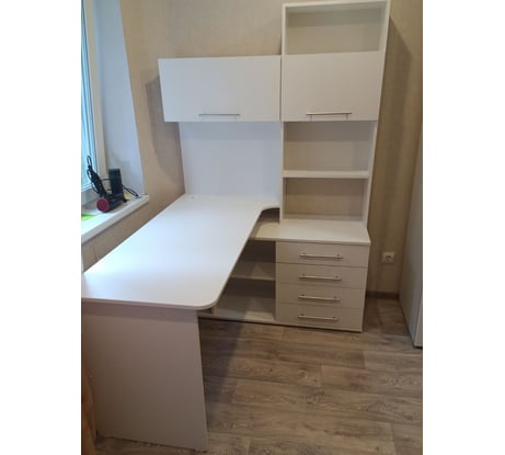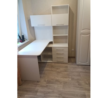 Модель сочетает в себе широкий компьютерный стол с размером столешницы 1400 мм, тумбу с ящиками, полками и нишей под системный блок. Высокая надстройка имеет открытые полки и два закрытых шкафа. Двери шкафчиков открываются вверх. Внутренний размер ящиков — 456х346 мм.