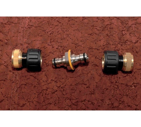 Это единственный (доступный на момент покупки) двойной коннектор, у которого средняя часть достаточно большого диаметра и “есть за что ухватиться” при отсоединении. Это основная причина покупки этого двойного коннектора, т.к. у меня нынешнее основное требование: чтобы УДОБНО РАЗЪЕДИНЯТЬ шланги. Был негативный опыт с аналогичными двойными коннекторами, когда отсоединять было очень проблематично/тяжело/сложно, для отсоединения требовался инструмент (пассатижи и т.п.), с повреждением носика коннектора Папа. Особенно всё это неприятно при низкой температуре, а особо сурово, когда ниже нуля. У этого очень тяжёлого металлического коннектора есть защитное прорезиненное кольцо (резина?/пластик?), чтобы не повредить/разбить плитку. Это кольцо для меня - дополнительное удобство для разъединения шлангов, предполагал, что это кольцо сорвётся, но все мои фирменные коннекторы отсоединялись легко. Пальцами это кольцо не удалось сорвать даже ради эксперимента ;) На фото есть опробованные коннекторы на шланги KARCHER и CLABER (старого и нового образца CLABER), BOSCH я так же особо тщательно опробовал (у меня бош - это основные в большом кол-ве коннекторы на шланги, но бош не фотографировал, т.к. все они на шлангах. Получил оба заказанных коннектора битыми, у каждого есть множественные повреждения покрытия, т.к. нет НИКАКОЙ упаковки (позор фирме Hozelock!), очень неприятно, но это не влияет на сегодняшнюю работоспособность, поэтому минус за это не ставлю. Эти множественные повреждения покрытия металла могут сказаться со временем, с годами (коррозия).
