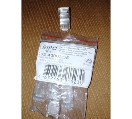 У данных коннекторов-Ripo RJ45/8P8C под витую пару,Cat.6(Класс EA),универсальные ножи много достоинств:ножи латунные(не магнитятся) с тремя зубьями;контактные площадки на ножах довольно широкие и гладкие по сравнению с многими недорогими подобными коннекторами;пластик крепкий,не хрупкий, выдерживает многочисленные нагрузки при интенсивном использовании не ломаясь;обжимаются кримпером хорошо,на кабель витая пара садятся очень крепко;за счёт того что у ножей 3 зуба,врезаются в жилу ровно и надёжно,не заминая её;в гнездовой разьём заходят легко и надёжно в нём фиксируются не шатаясь;доступная цена.