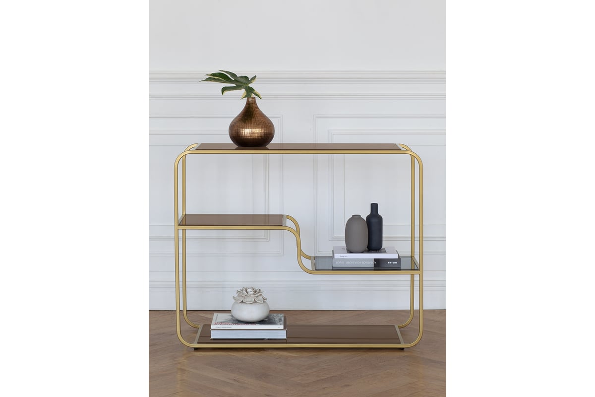 Консоль SIENA с золотым основанием из стали и полками из тонированного стекла оттенка бронзы. Размеры: 1000х350х810 мм. Элегантная консоль подойдет для зонирования гостиной, спальни и входной зоны. Консоль в прихожую дополнит интерьер квартиры, офиса, салона и загородного дома. Консоль с 4-мя стеклянными полочками можно использовать как туалетный столик, место для хранения декора, техники и аксессуаров. Закаленное стекло отличается высокой прочностью и надежностью, обеспечивает долговечность и безопасность конструкции. Консоль доставляем в собранном виде в надежной упаковке.