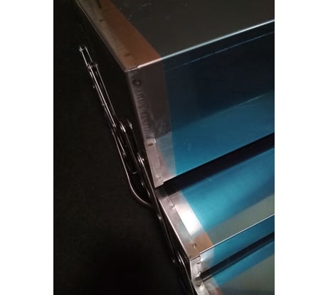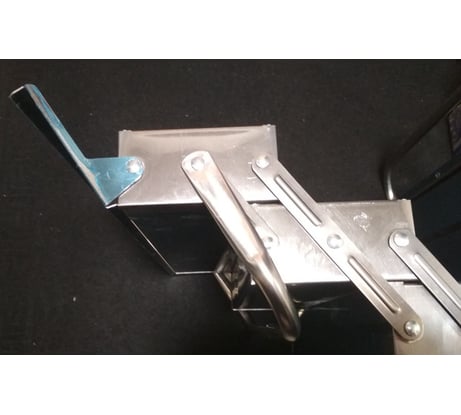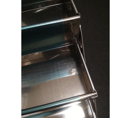 Если ручки опустить по бокам, то ширина 25см. (ручки не прислоняются вплотную прямыми частями, изгиб не даёт), высота при этом от пола до верха гребня 22,7см. С ручками наверху высота 30,5см. Ширина при этом 21см. Ручки выходят за габарит. Длинна ящика с ручками (размер ниши, куда он влезет своей длинной) 38см. И "гребень" на крышках у меня не такой как на картинке. У меня просто вертикально изогнутый лист крышки, сложенный прессом вдвое (лист 0,5мм, гребень 1мм). А на картинке на гребне Г-образный изгиб. Толщина листа боковин 0,47мм, толщина листа дна 0,5мм. Толщина листа рычагов 1мм, плюс они ещё формованные. Всё магнитится, кроме ручек. Наверное ручки сделаны из "более пищевой" неражавейки. Все острые грани от вырубки направлены внутрь, так что края не царапаются и пальцы не режут, даже по углам (хотя если надавить и провести вдоль... ну так и туалетной бумажкой можно порезаться :).