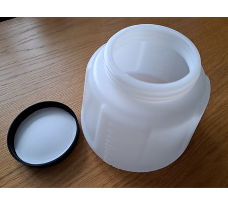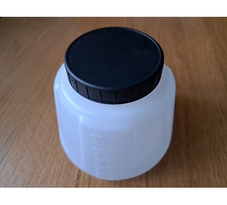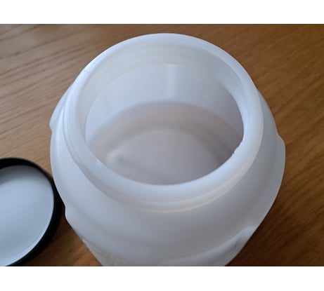 Добротный, сделан из полиэтилена высокой плотности, жёсткий, но при этом эластичный. Сбоку есть чёткая градуировка. Крышка имеет прокладку и привинчивается плотно. Заусенцев и облоя нет.