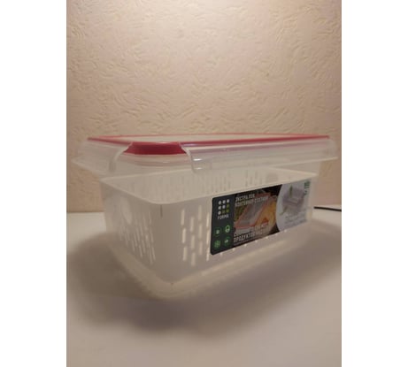 Отличный крепкий контейнер, имеется внутри вкладыш пластиковый по размеру контейнера, например для хранения зелени либо можно как дуршлаг использовать. Защелки не хлипкие.