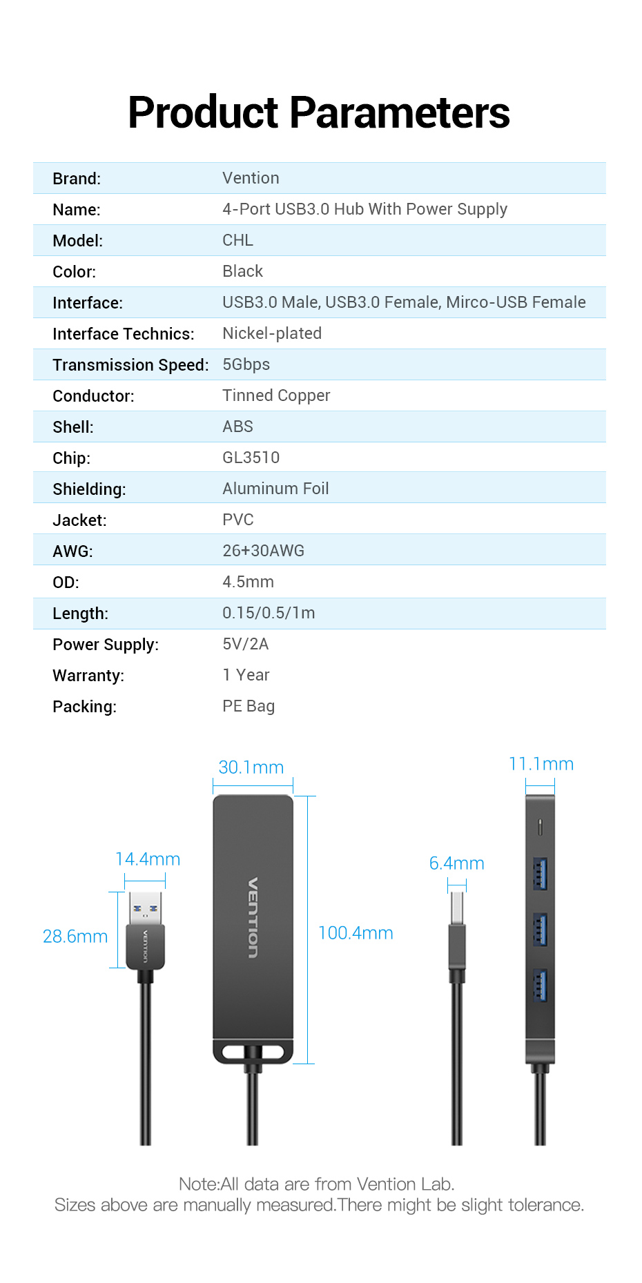Технические характеристики VENTION OTG USB 3.0 на 4 порта Черный - 0.15м. CHLBB
