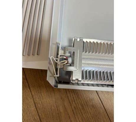 Спустя год использования случайно увидел небольшие вспышки внутри. Оказалось провода к нагревателоному элементу присоедены простыми клемами (папа-мама). Я в шоке, клема была не плотная и начало потихоньку короть контакт. А ведь я оставлял их в доме для поддержания тепла! Чуть не случился пожар. На фото видно, что изоляция превратилась в труху и началось оплавление! Металл на конвекторе тонкий, ножки из за этого разболатись через месяц.