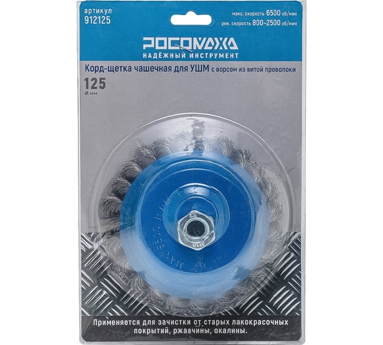Корд-щетки «РОСОМАХА» используется для шлифовальных и обдирочных работ. Идеальны для удаления застарелых лакокрасочных покрытий, въевшейся грязи, ржавчины, окалины с поверхностей стальных изделий. Рабочая поверхность щетки — витая стальная проволока.