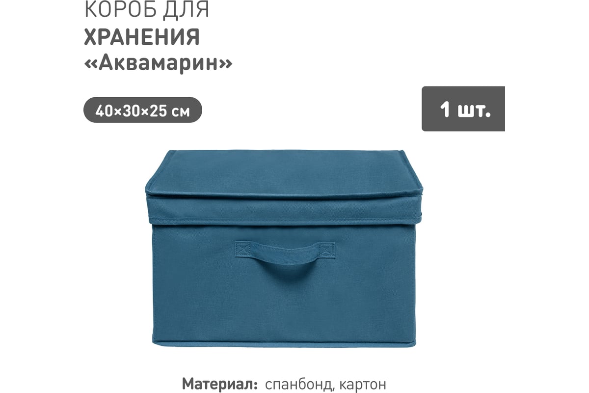 Короб для хранения из коллекции "Аквамарин" от Handy Home изготовлен из нетканого материала синего цвета и идеально подойдет для бережного хранения вещей на полках шкафов и стеллажей. Короб имеет удобную эргономичную ручку и крышку для защиты вещей от пыли и влаги. Складная конструкция короба позволяет компактно хранить его в сложенном виде и легко собрать для дальнейшего использования. Практичный спанбонд обладает высокой воздухопроницаемостью для вентиляции и свободной циркуляции воздуха, но при этом прочен и устойчив к истиранию и сминанию. Широкий ассортимент аксессуаров для хранения из коллекции "Аквамарин" позволит создать порядок и гармонию в вашем гардеробе. Материал: спанбонд, картон.