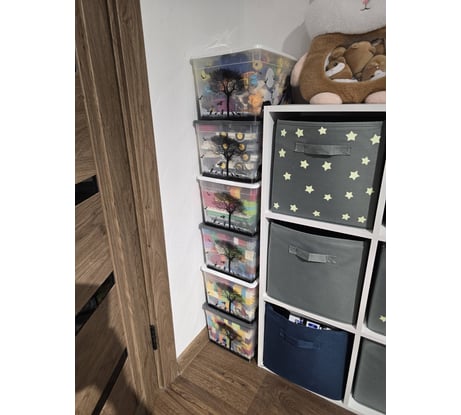 Один из немногих ящиков с шириной 26 см, что позволяет разместить их по 3 шт. на полку пластикового стеллажа 80 см.