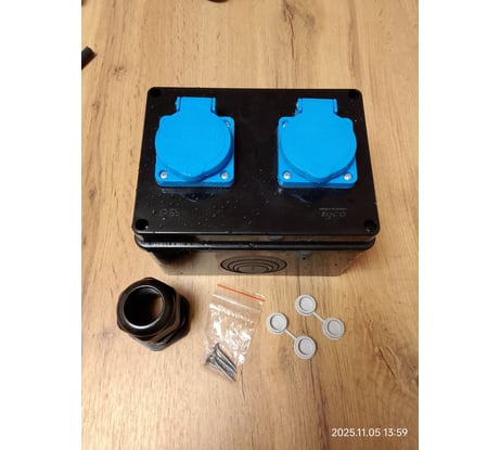 Очень хороший вариант для уличной установки, когда надо совместить распаечную коробку с уличной розеткой. В данном случае установлен на парковке под открытым небом для управления воротами. Коробка выполнена очень добротно, пластик качественный, прокладки и крепеж на высоте. В комплекте есть гермоввод, но подойдет только для 32 гофры. Оставим в хозяйстве, вдруг пригодится ))