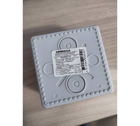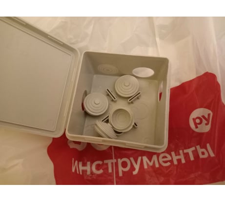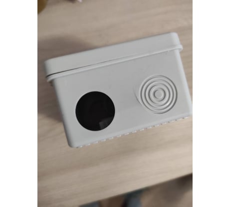 Обычная наружная распредкоробка. Вес 59.6г, габариты по крышке 88.5х92.5х55.5мм (основание 83х83мм). Крышка откидная - с одной стороны имеет сцепление с корпусом (какбы петля дверцы; при полном нагруженном раскрытии или спустя несколько десятков, в зависимости от температуры окружающей среды, простого открывания-закрывания ожидаемо надрывается). С другой стороны на крышке выступ (язычок) для открывания, который при необходимости можно срезать. Закрывается и открывается без нареканий (скажем так, как надо, и так бывает далеко не у всех аналогичных изделий). Жесткость пластика средняя, не воняет. Маркировки на корпусе: 400V, материал PP-FR, огнеустойчивость 650градусов. На этикетке IP54, срок службы 15 лет, условия эксплуатации от -25 до +60 градусов, произведено в России, г.Пермь.