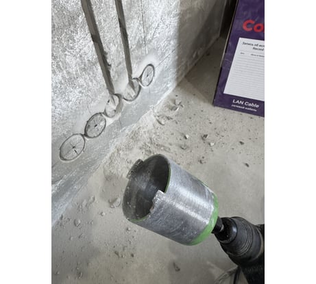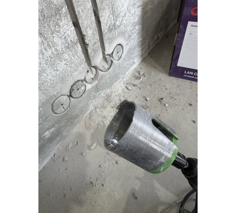 вот думал будет сложно, а с магнитным держателем и центровочным буром все просто, коронка прошла бетон и арматуру без проблем
