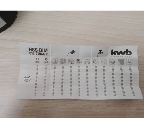 Хорошая заточка. Переменный шаг зубов. Есть доп отверстия, на задней стенке, для выталкивания забившегося материала. Положили инструкцию, для любителей "оборотов побольше - просверлит быстрее"( она их не остановит ).