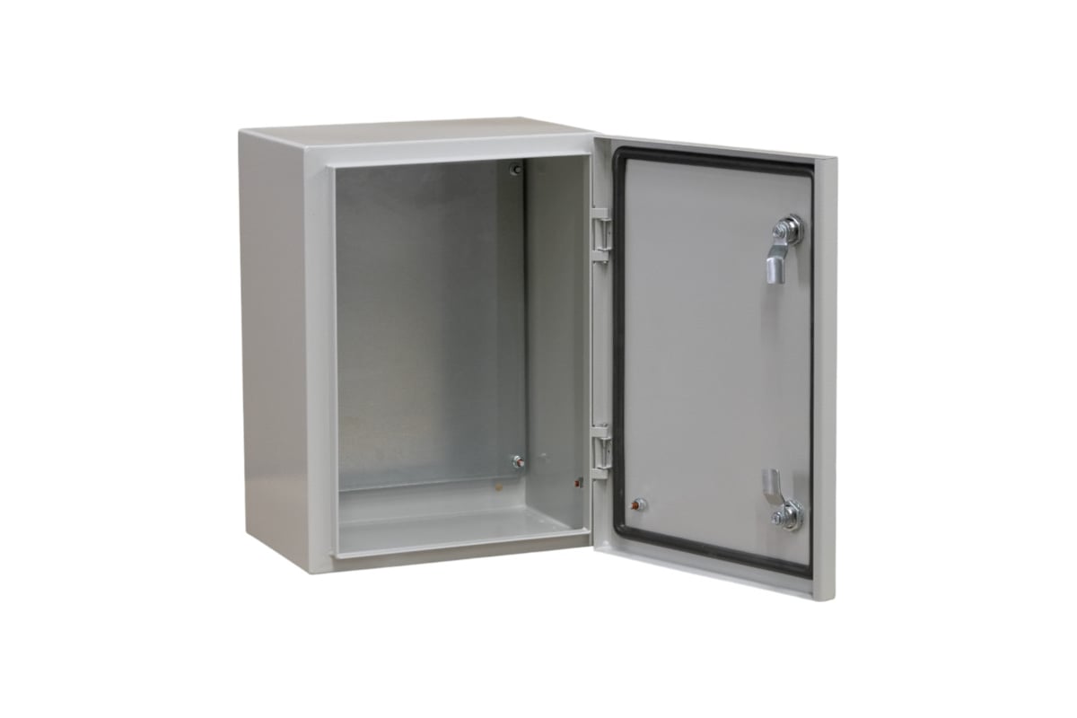 Двойной гиб на корпусе обеспечивает лучшее прилегание уплотнителей, увеличивая их срок службы и повышая герметичность конструкции. Дополнительная отбортовка двери повышает ее жесткость в области замков, делая дверь более устойчивой к механическим воздействиям. Приварные шпильки обеспечивают прочную фиксацию монтажной панели внутри корпуса, исключая возможность её случайного сдвига. Отбортовка монтажной панели улучшает её устойчивость к деформациям при монтаже и эксплуатации. Замки покрыты оцинкованным покрытием, защищающим их от коррозии и продлевающим срок службы. Угол открытия двери стал больше благодаря дополнительному вырезу на двери под петлей, что облегчает доступ к внутреннему пространству шкафа.