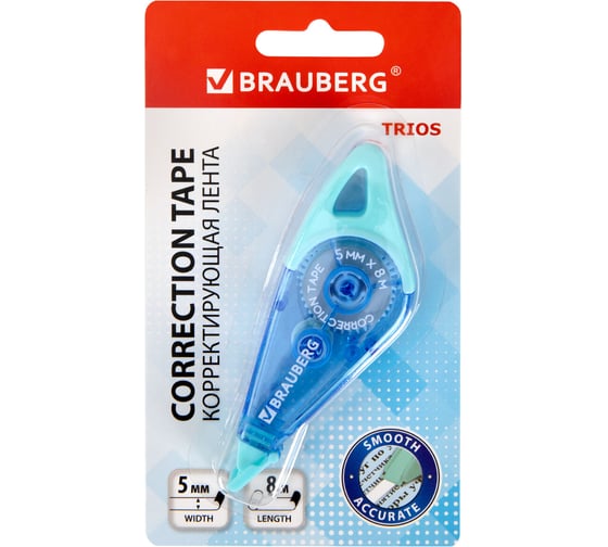 Корректирующая лента BRAUBERG TRIOS, 5 мм х 8 м, корпус мятно-голубой с подвесом, блистер, 273023