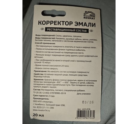Корректор эмали Resmat белый, 20 мл, блистер 2703