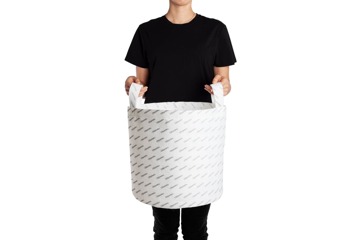 При изготовлении изделия применяются безопасные и экологичные материалы, которые устойчивы к влаге (влагостойкая), быстро высыхают и не теряют своих свойств. Верхняя часть бака для белья закрывается текстильной вставкой с завязками, что позволяет скрыть содержимое корзины от лишних глаз. Изделие удобно складывается, в сложенном виде занимает минимальное количество места, при уборке легко перемещается, не царапая пол, в отличие от пластиковых корзин.