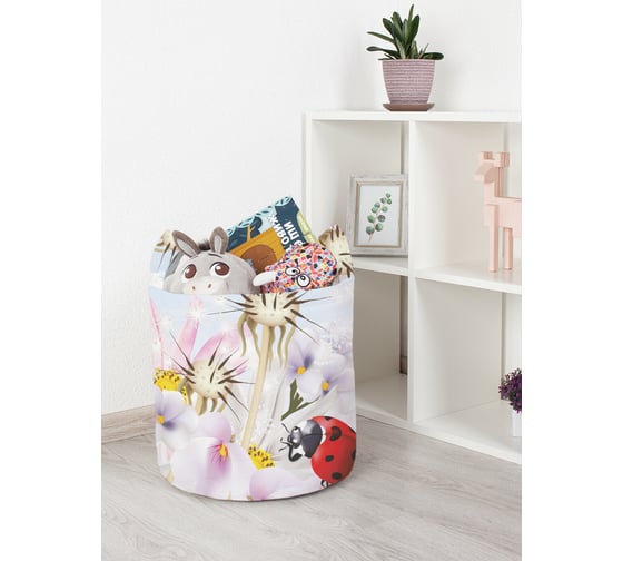 Изделие может выполнять множество практических функций, например, при поездке на природу в него удобно сложить запасную детскую одежду. В пустом состоянии корзина складывается и занимает минимальное количество места. Внутри изделия имеется тканевая крышка с фиксирующим шнурком, которая позволяет зафиксировать уже сложенные игрушки.