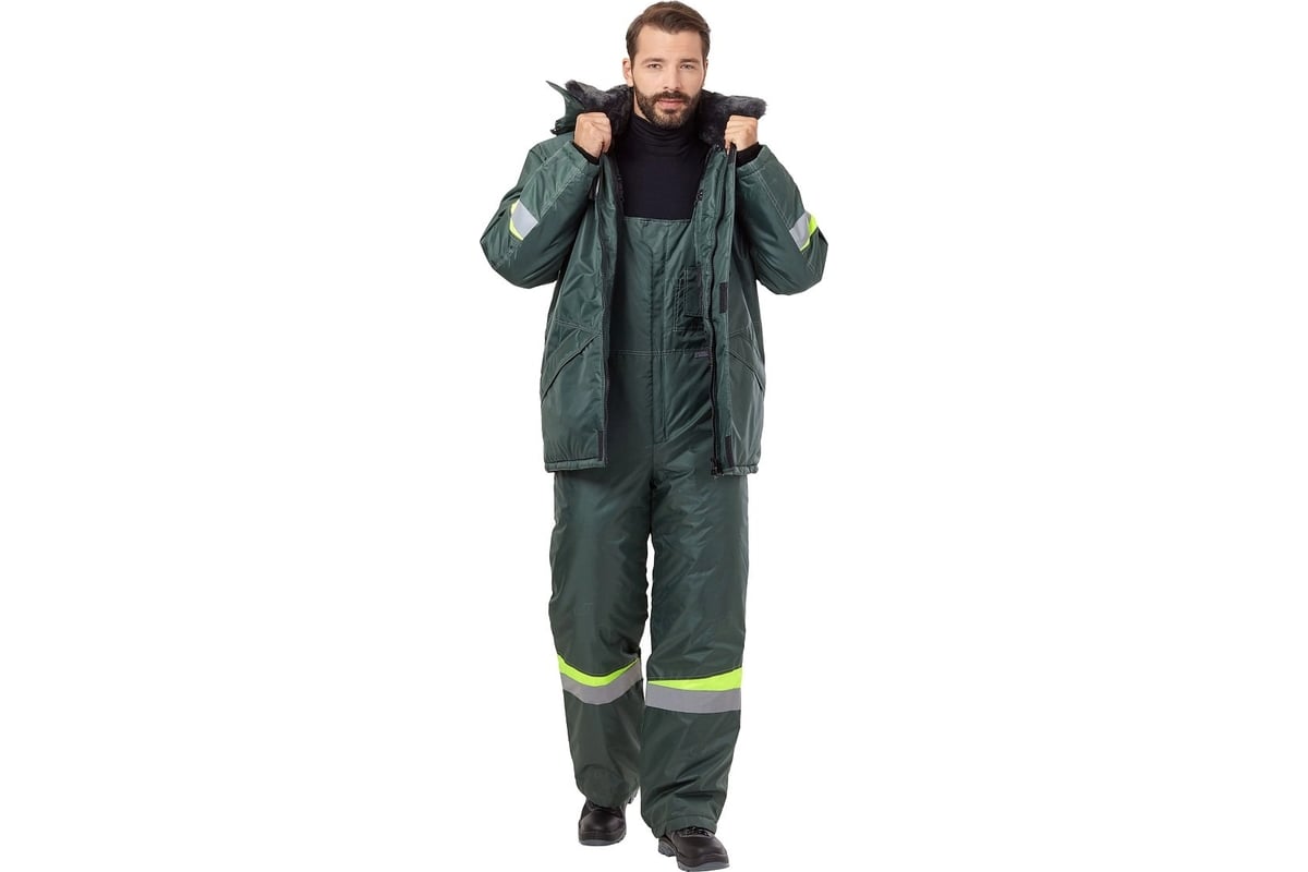 Костюм Эксперт Спецодежда Комфорт, темно-зелёный/неоновый, р. 56-58, рост 194-200 6446000061094 состоит из куртки и полукомбинезона. Соответствует 2 классу защиты от пониженных температур (III климатический пояс).