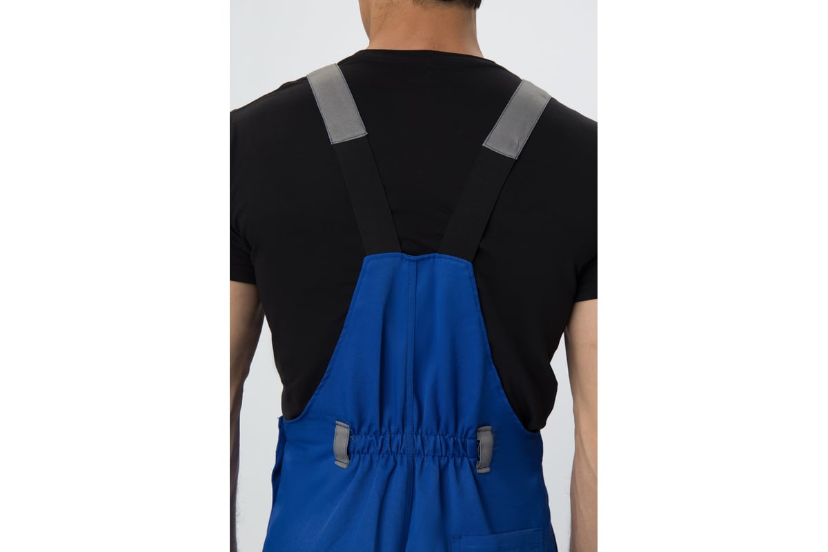 Полукомбинезон оснащен боковой застежкой в левом боковом шве на две петли и пуговицы и застежкой-гульфик на две петли и пуговицы. Для удобства использования по спинке вставлена резинка.