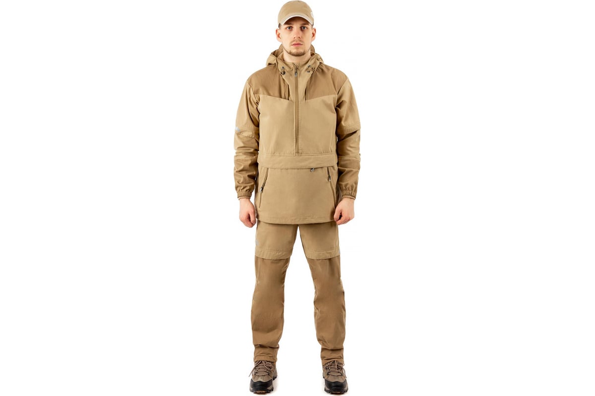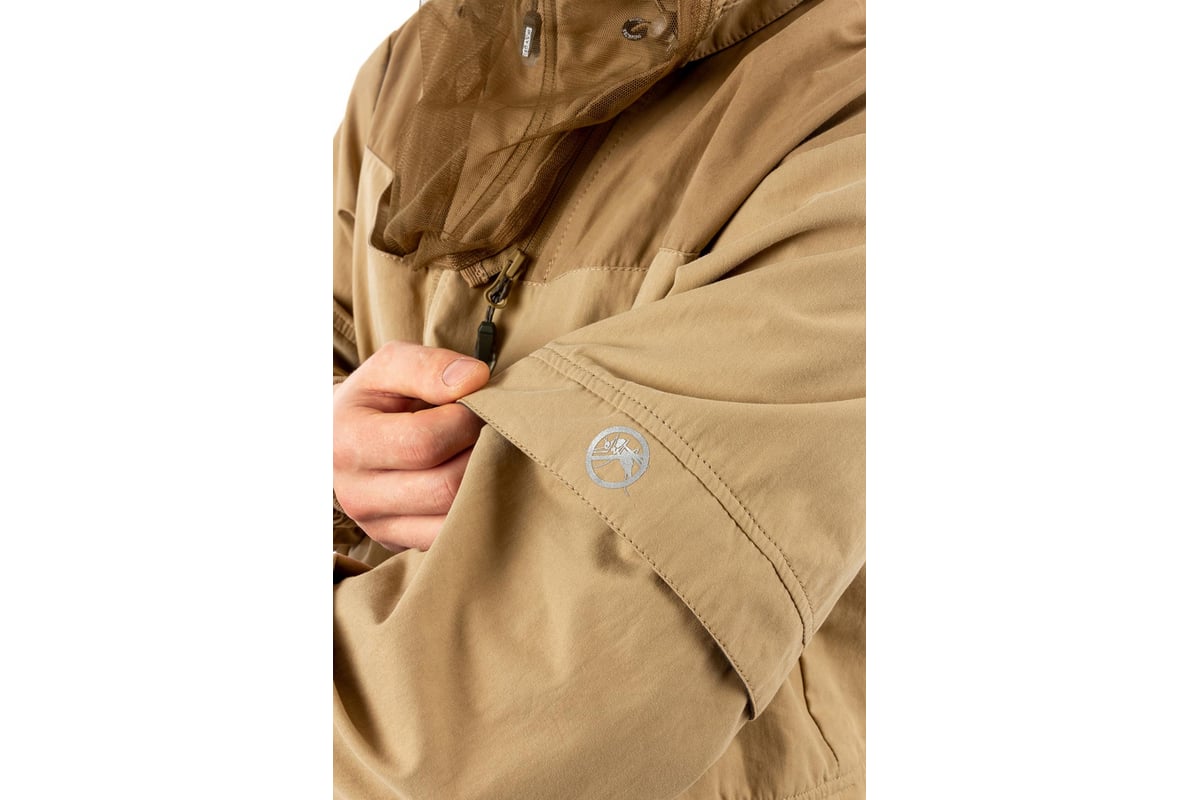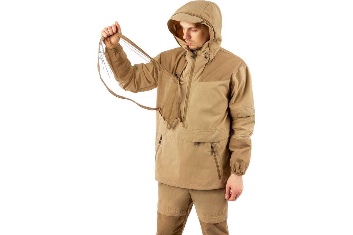 Рукава с плотными трикотажными манжетами. На капюшоне предусмотрена молния для противомоскитной сетки, которая компактно укладывается в карман на груди. В передней части куртки предусмотрен объемный передний влагозащитный карман и два боковых.