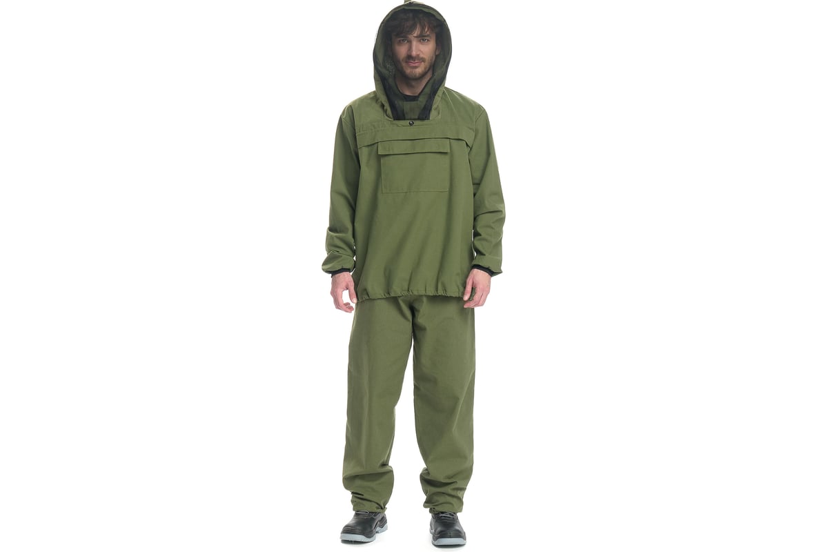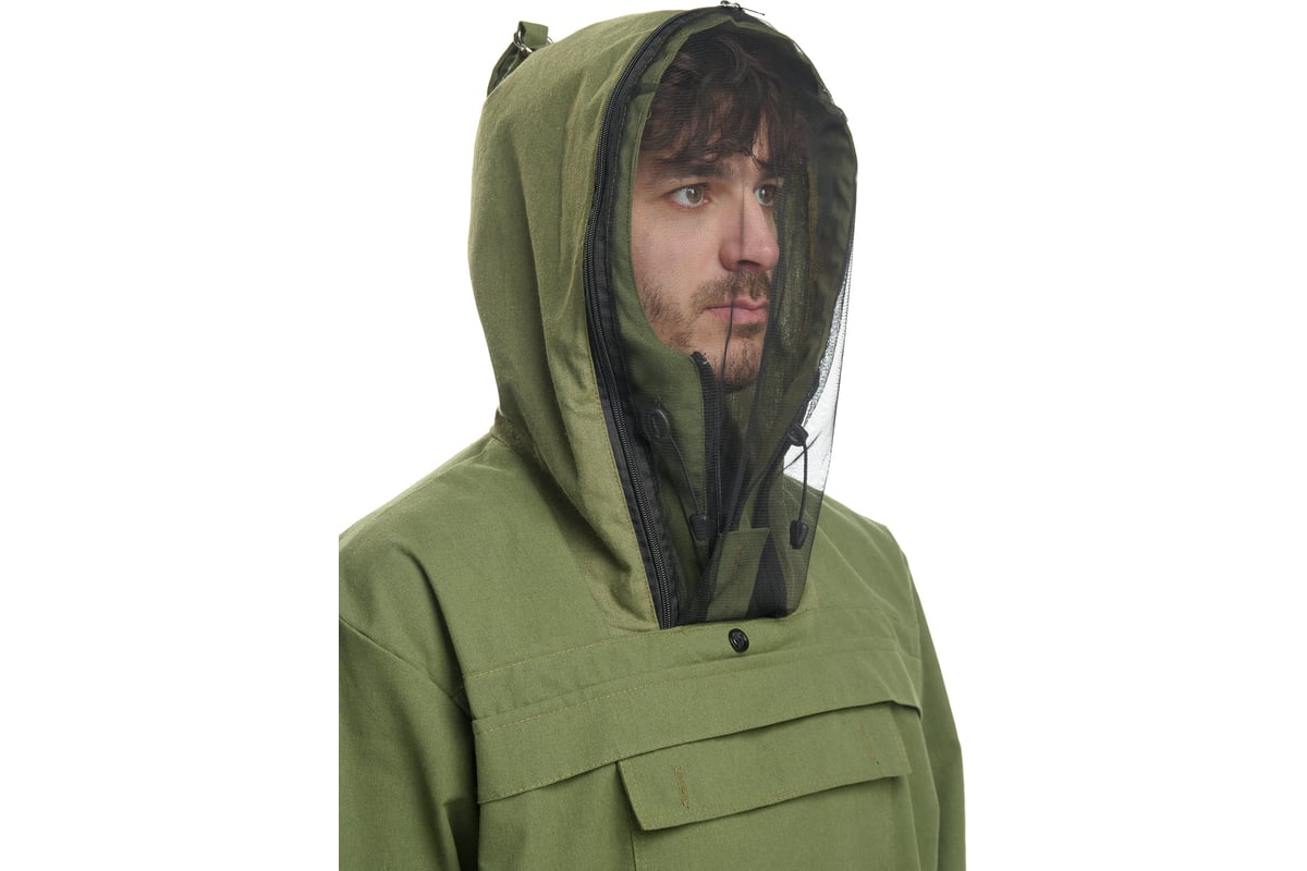 - Куртка с капюшоном, укомплектованным съемной противомоскитной сеткой. На груди накладной карман с клапаном. Низ рукава обработан трикотажной манжетой. Низ изделия по ширине регулируется шнуром с фиксатором.