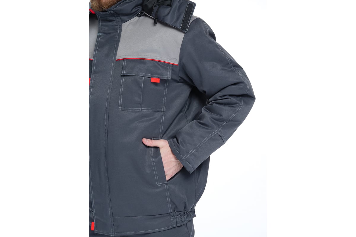 Куртка утеплённая, укороченная с притачным поясом, с регуляторами ширины на контактной ленте, супатной застёжкой на молнии. Капюшон застегивается на контактную ленту и имеет регулировку по форме лица. Правый верхний накладной карман с клапаном с застежкой на липучке. Левый верхний накладной карман с двумя отделениями. Нижние карманы втачные. Рукава усилены налокотниками с вытачками для удобного сгибания локтя. Подкладка-синтепон, ткань-полиэстер и хлопок. Хлопковое волокно в составе основного материала позволяет коже дышать, полиэстер делает ткань прочной и долговечной.