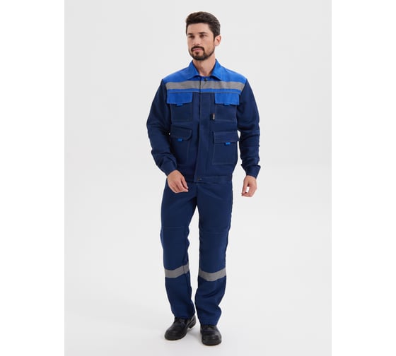 Костюм рабочий с брюками. Куртка прямого силуэта с супатной застежкой на пуговицы, с притачным поясом. Объём по бокам регулируется при помощи ленты велькро. Отложной воротник. Световозвращающая полоса по линии кокетки на полочках, на спине и по нижней части брюк, шириной 50 мм. На куртке имеются накладные карманы с клапанами: два нагрудных и два нижних. Манжеты рукавов застёгиваются на пуговицу. Все швы с контрастной отстрочкой. В области локтей и коленей усиления.