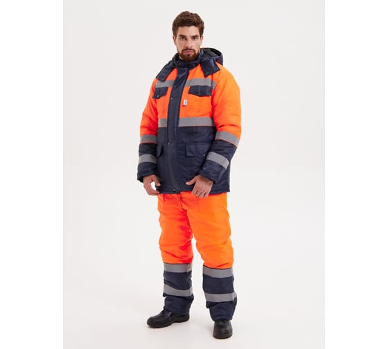 Куртка прямого силуэта с притачной утепленной подкладкой, центральной бортовой застежкой на тесьму молнию с ветрозащитной левосторонней планкой, застёгивающейся на кнопки. Куртка с втачными рукавами, с воротником – стойкой и капюшоном. Внутренний воротник из флиса. На куртке имеются накладные карманы с клапанами: два нагрудных и два нижних. Полукомбинезон прямого силуэта с двумя накладными карманами на притачной подкладке с центральной застёжкой - «молнией» и регулируемыми бретелями с застежкой на фастексы. Световозвращающая лента шириной 50 мм проходит по линии кокетки на полочках и спинке, низу куртки, средней части рукавов, и двойные в нижней части полукомбинезона, что соответствует III классу защиты сигнальной одежды.