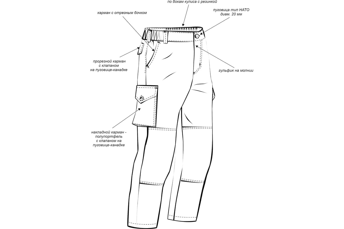 Брюки прямые свободные выполнены на поясе с резинкой и шлевками. Имеется застежка-гульфик на молнии и пуговице канадке. Для лучшей износостойкости предусмотрена усилительная накладка в области задней части брюк.
