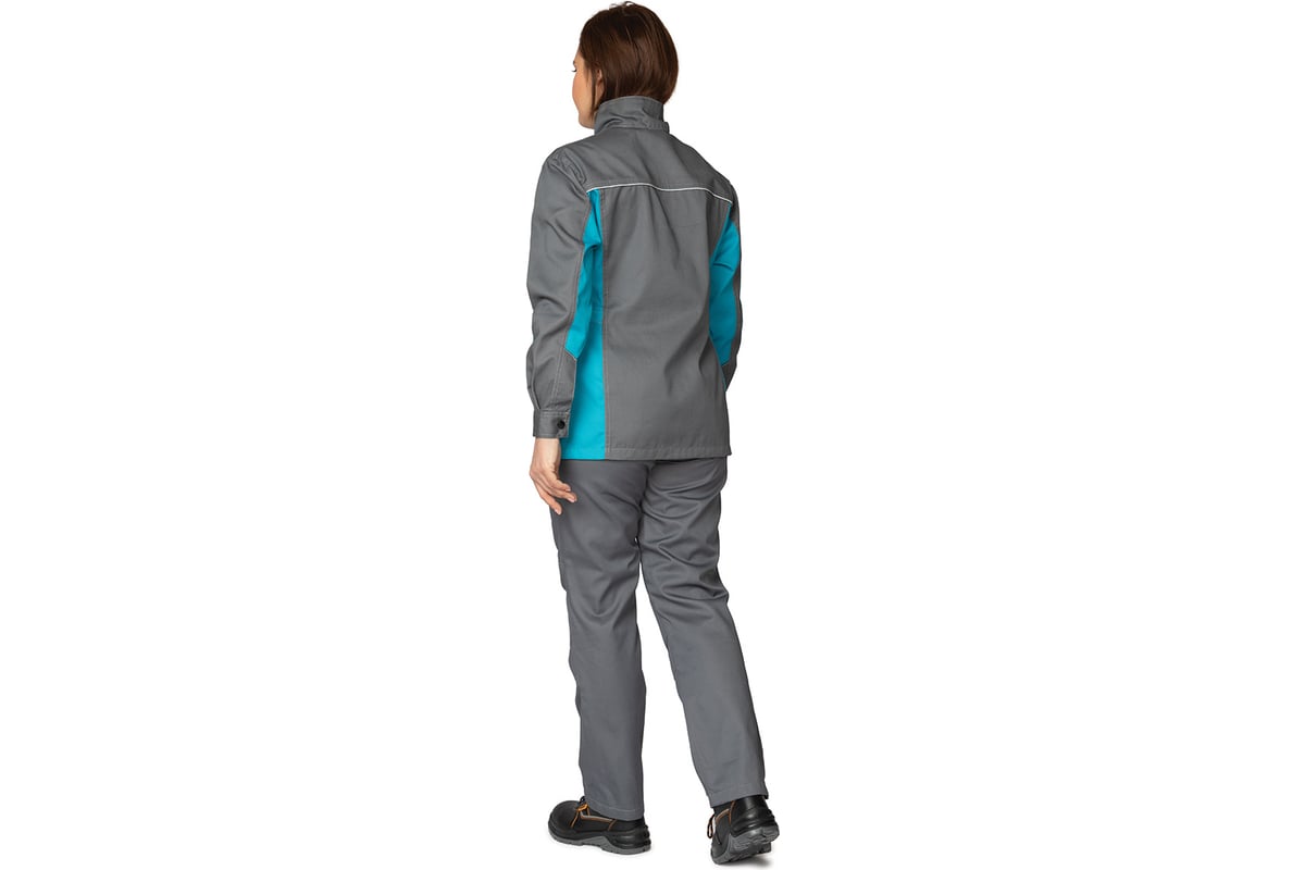 Костюм женский «Бренд 1» 2020 — это отличный вариант летней спецодежды для любых видов работ. Представленная в нашем каталоге серо-бирюзовая модель не маркая, смотрится стильно и имеет хорошие показатели прочности. Костюм состоит из куртки и брюк прямого кроя. Он выполнен из смесовой ткани, в составе которой 35% хлопка и 65% полиэстера, с водоотталкивающей пропиткой. В этом костюме можно работать с нетоксичными растворами, ткань устойчива к истиранию и производственным загрязнениям. Куртка: удлинённая, с центральной двухзамковой застёжкой-молнией. На линии талии куртки для регулировки объема талии расположена внутренняя кулиска с эластичной тесьмой и пуговицей. Рукав втачной, манжеты с фиксацией на кнопки. Воротник-стойка, застёжка на тесьму молнию. Под проймой — вентиляционные отверстия-люверсы. Брюки: прямого силуэта, с центральной застёжкой-молнией. Вытачки по линии талии на задней части брюк обеспечивают силуэтную посадку. На поясе 5 шлёвок для ремня. Объём по линии талии регулируется эластичной лентой в поясе по боковым швам. На коленях анатомические вытачки. Карманы. Куртка: два боковых кармана; верхние накладные карманы двойные, карманы с разделительной строчкой для размещения карандаша. Брюки: передние боковые карманы с наклонным входом; два задних кармана, левый карман с двойным накладным карманом, разделён строчкой на два отделения. Усилительные элементы: двойные отделочные строчки, закрепки. Сигнальные элементы: светоотражающий кант, ранцевая лента с СОП.