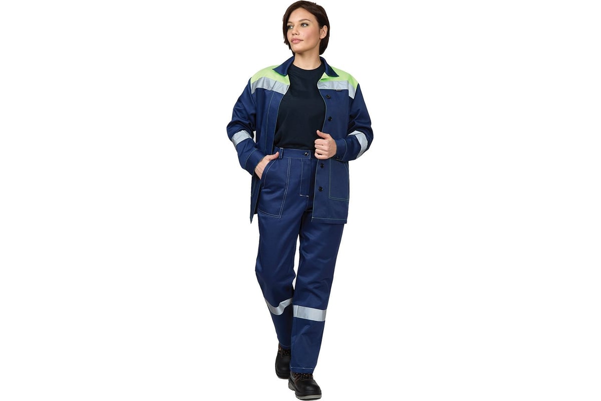 Рабочий костюм комплектуется удлиненной функциональной курткой и брюками с удобной посадкой. Рабочий женский костюм дает возможность комплексного предложеня костюмов "Пантеон" для мужчин и женщин. Куртка: удлинённая, прямого силуэта, супатная бортовая застежка на пуговицах, с уловителями для пуговиц. На спинке настрочена внутренняя кулиска с эластичной лентой для регулировки объёма по линии талии. Рукава втачные с манжетами на пуговицах. Воротник отложной. Брюки: прямого силуэта, с центральной застёжкой на молнию, с вытачками на поясе, с 5 шлёвками. Пояс брюк в области боковых швов регулируется эластичной тесьмой. Карманы: куртка: боковые карманы с наклонным входом. Брюки: боковые накладные карманы с наклонным входом. Сигнальные элементы: СОП 50 мм.