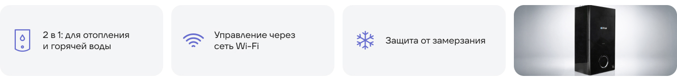 Отличный котел! Установили полгода назад, работает бесшумно и четко. Очень довольны: и дом теплый, и с горячей водой никаких проблем. Большой плюс — возможность управлять со смартфона через Wi-Fi, это невероятно удобно. Качество сборки на высоте, выглядит стильно. Рекомендую!