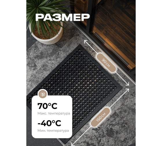Черный цвет делает изделие универсальным и легко вписывается в любой интерьер или экстерьер. Резина отличается износостойкостью и не теряет своих свойств даже при длительной эксплуатации на улице. Уличный вариант подходит для размещения перед входом в дом, офис или кафе, а также в подсобных и хозяйственных помещениях.
