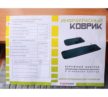 - Потребляемая мощность коврика Sun Power 80x25 32 Вт.