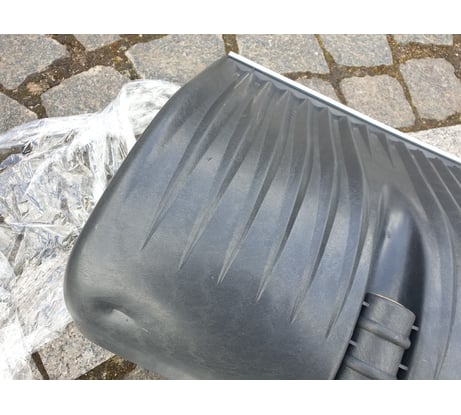 Сломалась сразу, не успев отработать и минуты. Лопнул пластик в месте посадки на черенок, при том, что ковш и черенок лежали дома и были теплыми, и устанавливались тоже дома. Пластик тонкий и легко ломается даже не на морозе. Сравнив данный ковш с тем что использовался ранее обнаружилось что он тоньше раза в 3. В итоге поставил старый ковш, а с этого взял алюминиевую планку.