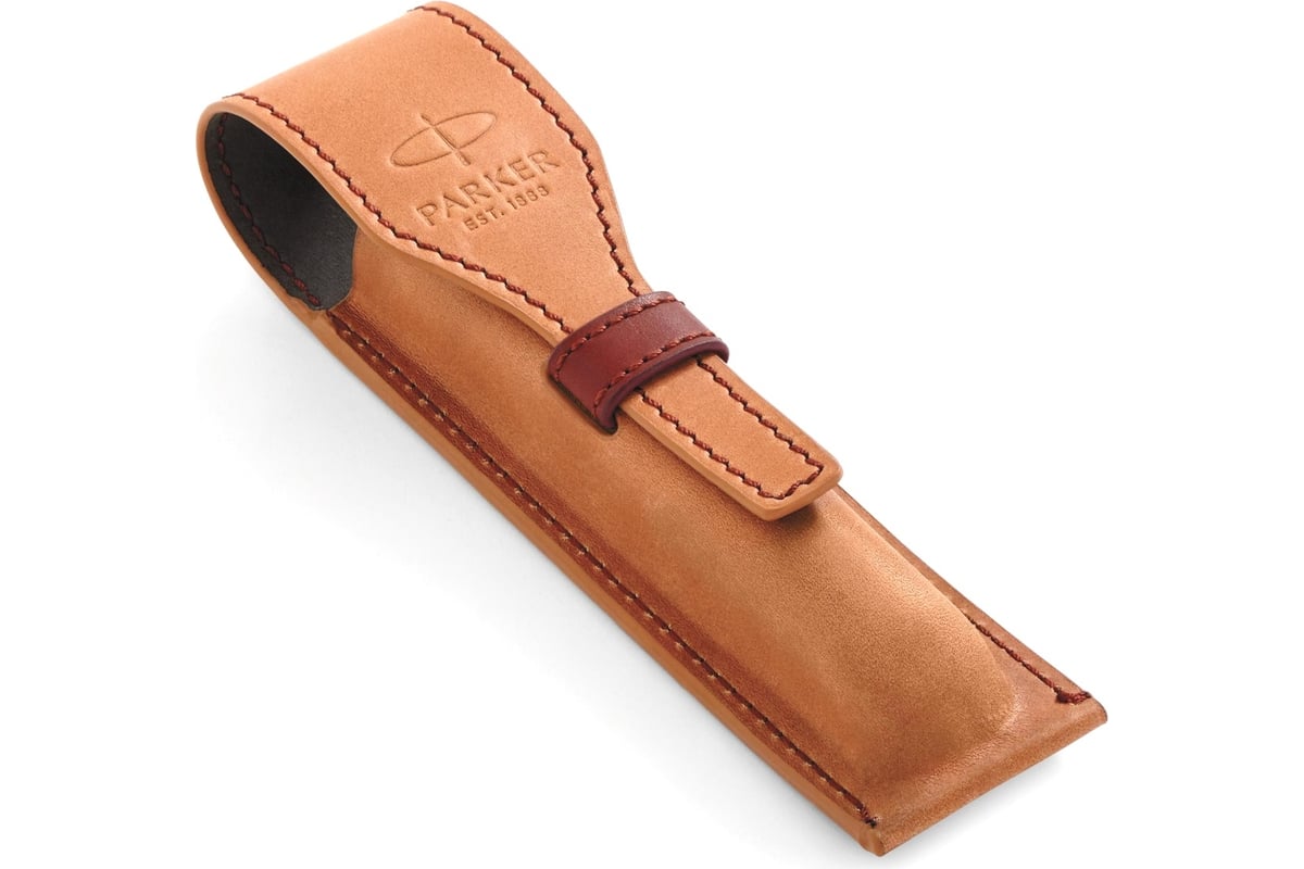 Кожаный чехол для ручки Parker, коричневый 2029730 выполнен из натуральной гладкой воловьей кожи. Застежка: специальный регулируемый клапан с петлёй с регулируемой длинной чехла. Отделка: прошит фактурной нитью коричневого цвета, тиснение логотипа компании Parker и надписи "EST. 1888"