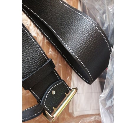 Очень похож на офицерский, но всё же не он. Чёрная кожа с белой прострочкой, знакомая пряга с двумя шпеньками.