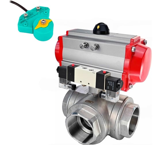 Кран шаровой 3-ходовой применяется в качестве запорной арматуры в системах теплоснабжения, водоснабжения, в паровых, топливных и пневмосистемах со сжатым воздухом и нейтральными газами. Установка кранов данной серии возможна в системы транспортирующие жидкие и газообразные среды (вода, нефть, масла, пар, воздух, спирты, гликоль и др.), неагрессивные к материалам крана.Принцип работы: Перекрытие рабочего потока происходит посредством запирающего элемента, которым служит шар со сквозным цилиндрическим отверстием. Основным отличием от обычного муфтового крана является наличие трех патрубков присоединения с внутренней резьбой.Пневмоприводы двойного действия DA-х используют два порта для подачи среды управления и создания движения в обоих направлениях, как для открытия, так и для закрытия арматуры. Пневмораспределитель DN.ru 4V320-8/10 AC220V с двусторонним ЭМУ (электромагнитным управлением). Пневмораспределитель служит для изменения направления, пуска, остановки потоков сжатого воздуха в пневматической системе в зависимости от внешнего управляющего воздействия.Магнитный переключатель DN.ru МППП-200 предназначен для преобразования конечных значений положения вала пневматических приводов или запорной арматуры в электрические сигналы. Функционирование магнитного переключателя основано на срабатывании двух независимых, полностью герметизированных, магнитных датчиков, расположенных внутри U-образного корпуса.
