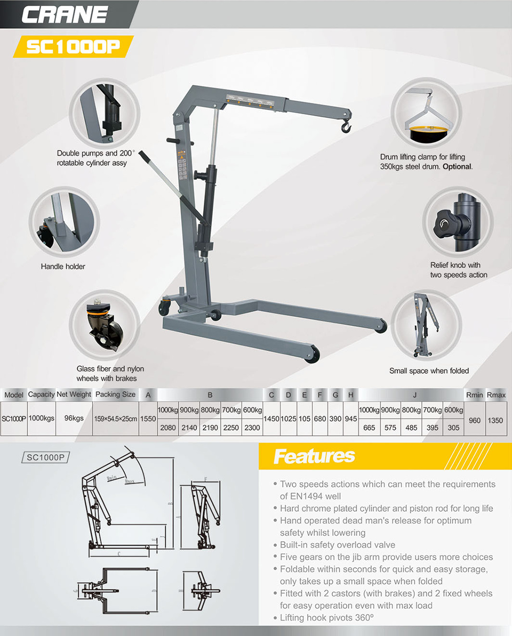 Гидравлический насос с ручным приводом и защитный клапан, контролирующий перегрузку, создают удобство и безопасность в работе. Пятиступенчатая стрела позволяет пользователям легко адаптироваться к выполняемой работе. Подъемный крюк вращается на 360 градусов. 2 поворотных колеса и 3 фиксированных колеса дают хорошую устойчивость и легкое маневрирование даже при максимальной загрузке. Колеса изготовлены из высокопрочного нейлона со стекловолокном и не портят покрытие в цеху. Кран складывается за считанные секунды и занимает мало места.