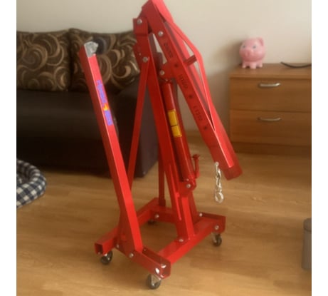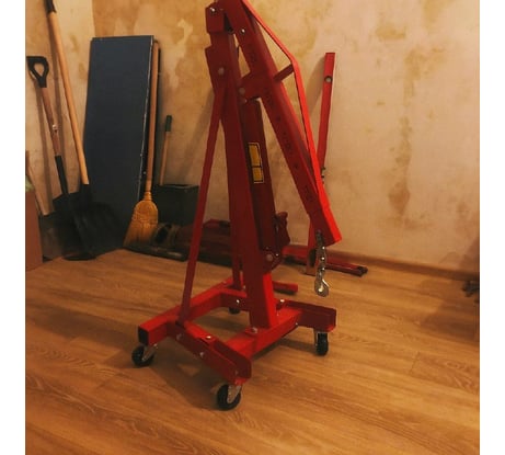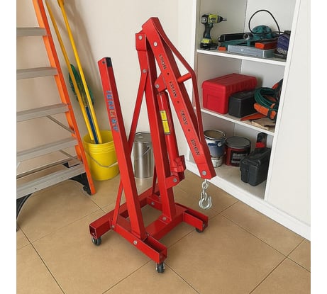Кран-стойка для подъёма мелких движков и узлов, складывается для хранения. Гидравлический подъёмник с клапаном безопасности, ручной насос — подъём плавный и предсказуемый. Принцип: гидравлическая система + рама, выдерживает до 1 тонны. Для гаража супер — удобно и надёжно.