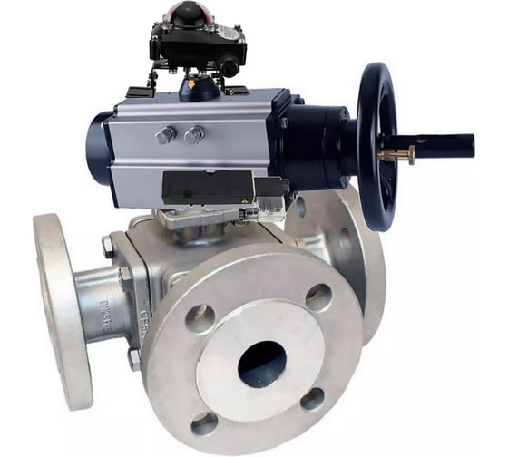 Кран шаровой DN.ru 316-316-PTFE-16 ISO 3-ходовой, T-тип, Ду100, Ру16, БКВ, пневмораспределитель D160-34226