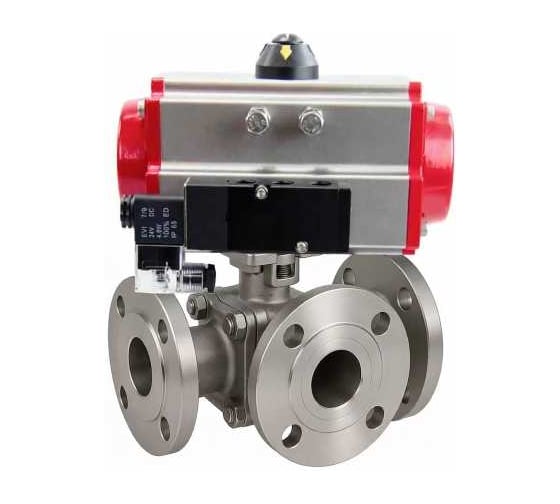 Кран шаровой DN.ru 316-316-PTFE-FP-3L-F-ISO-H Ду50 Ру16 HYMT, 3-ходовой L-тип фланцевый, пневмопривод SA-105, пневмораспределитель 220VAC D160-77145