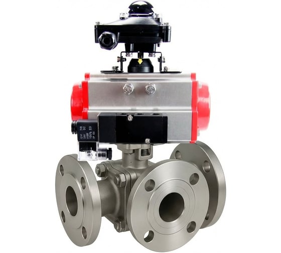 Кран шаровой DN.ru 316-316-PTFE-FP-3L-F-ISO-H Ду50 Ру16 HYMT, 3-ходовой L-тип фланцевый, пневмопривод SA-105, пневмораспределитель 24VDC, БКВ LSB-410 Ex D160-77185