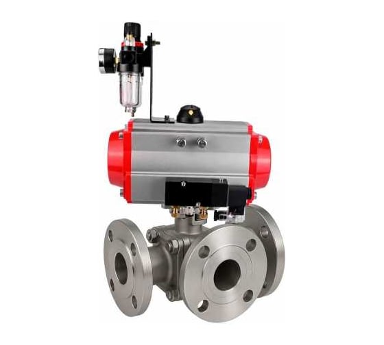 Кран шаровой DN.ru 316-316-PTFE-FP-3L-F-ISO-H Ду50 Ру16 HYMT, 3-ходовой L-тип фланцевый, пневмопривод SA-105, пневмораспределитель 24VDC, БПВ D160-77350