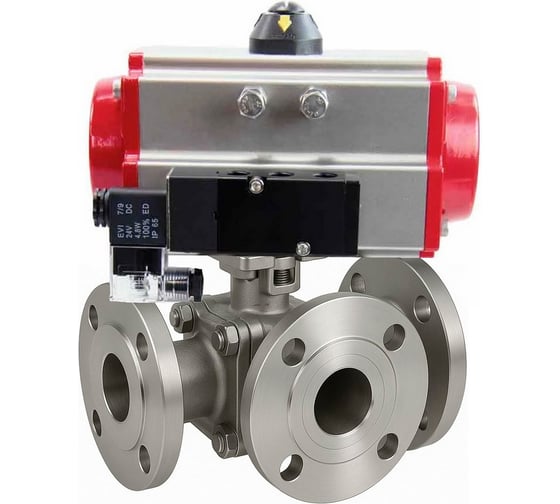 Кран шаровой DN.ru 316-316-PTFE-FP-3L-F-ISO-H Ду80 Ру16 HYMT, 3-ходовой L-тип фланцевый, пневмопривод DA-105, пневмораспр. (2EM) 220VAC D160-77207