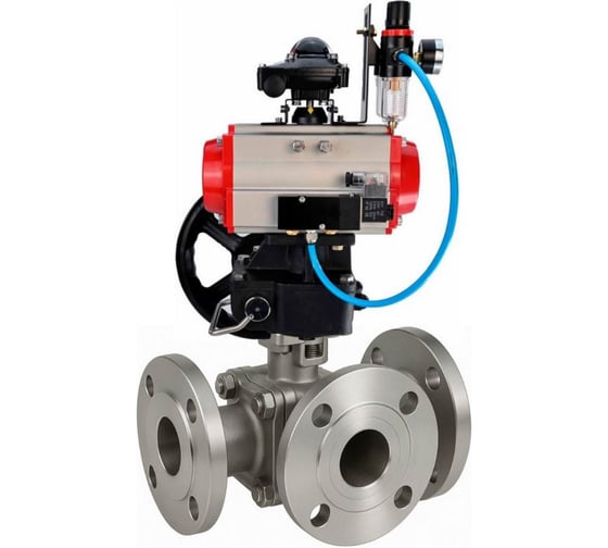 Кран шаровой DN.ru 316-316-PTFE-FP-3L-F-ISO-H Ду80 Ру16 HYMT, 3-ходовой L-тип фланцевый, пневмопривод DA-105, пневмораспр. (2EM) 220VAC, дублёр HDM-3, БКВ LSB-410 Ex, БП D160-77474