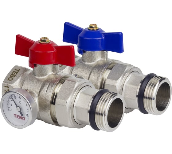 Кран шаровой TEBO с термометром прямой ВН/НАР 1, в комплекте 2 шт. (красная + синяя бабочки) T-КШ.Т.502.1.КСБ.CN